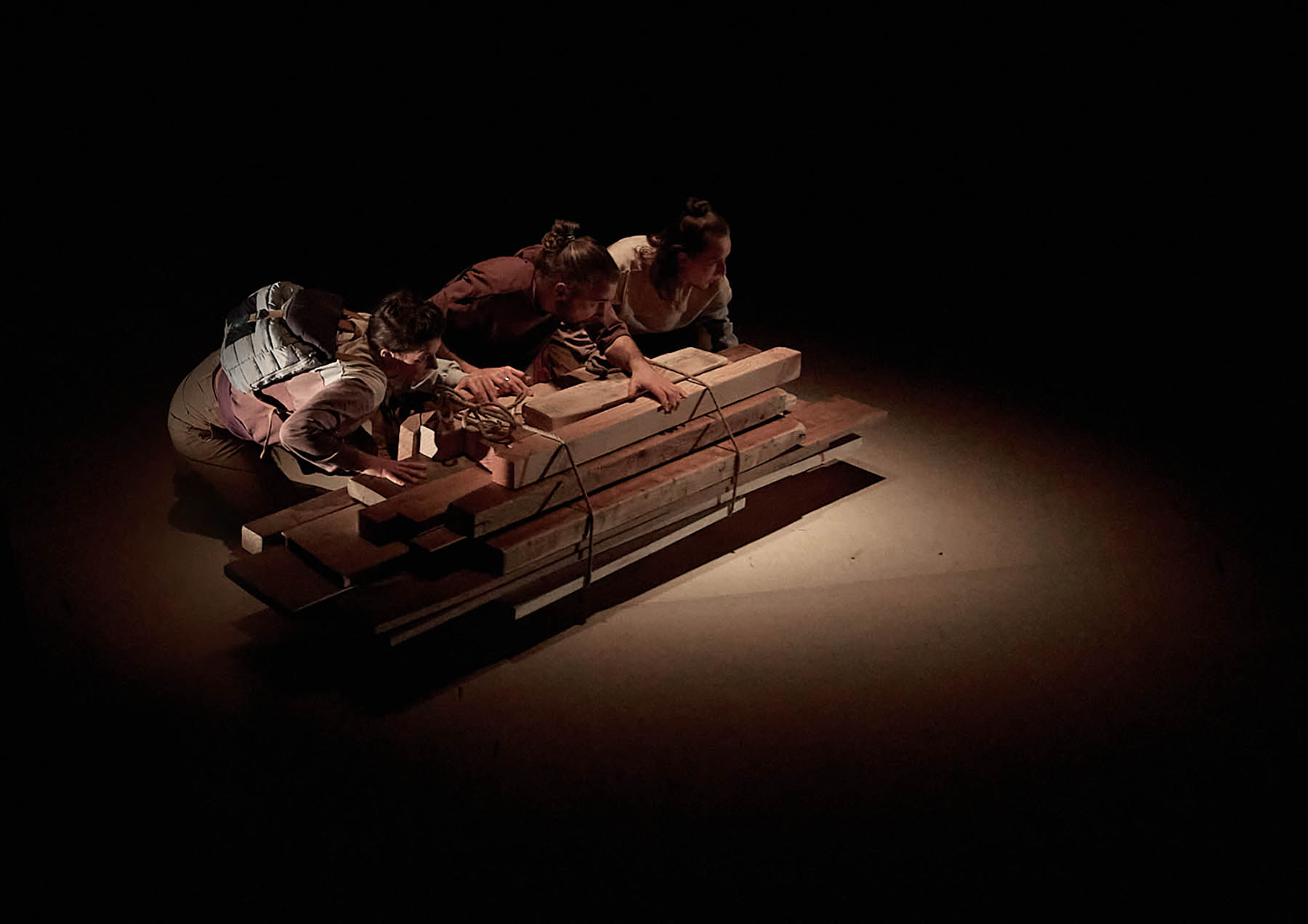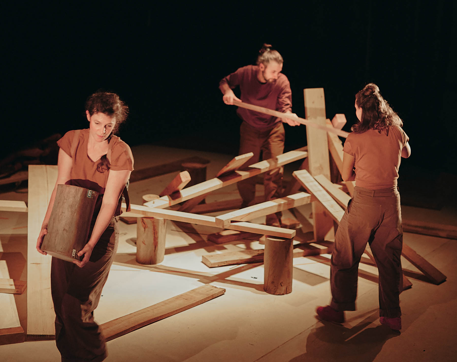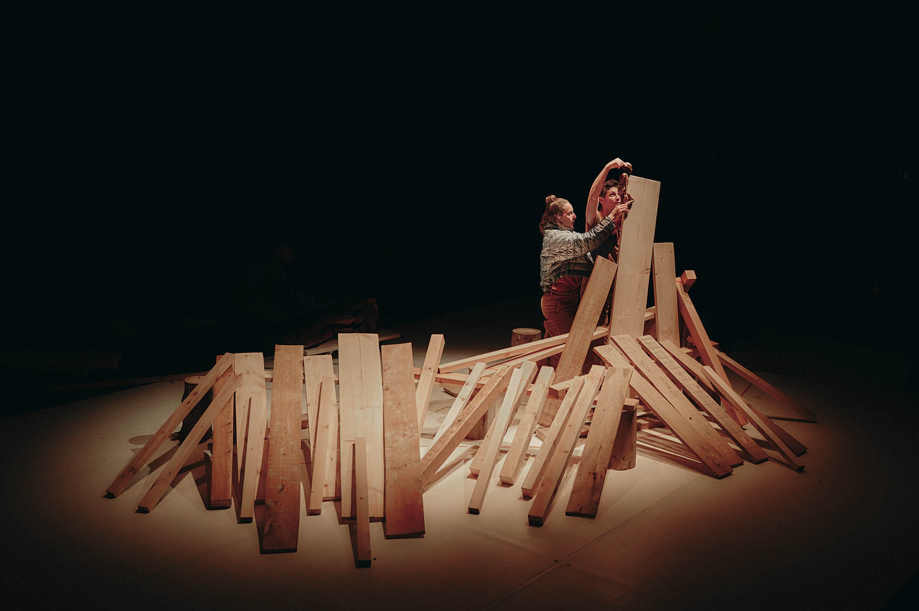 Avec Terre Étrangère, la Compagnie Juste Après tente de raconter l’exil et ces phénomènes de traversées multiples entre ICI et LÀ-BAS, avec des morceaux de bois… »